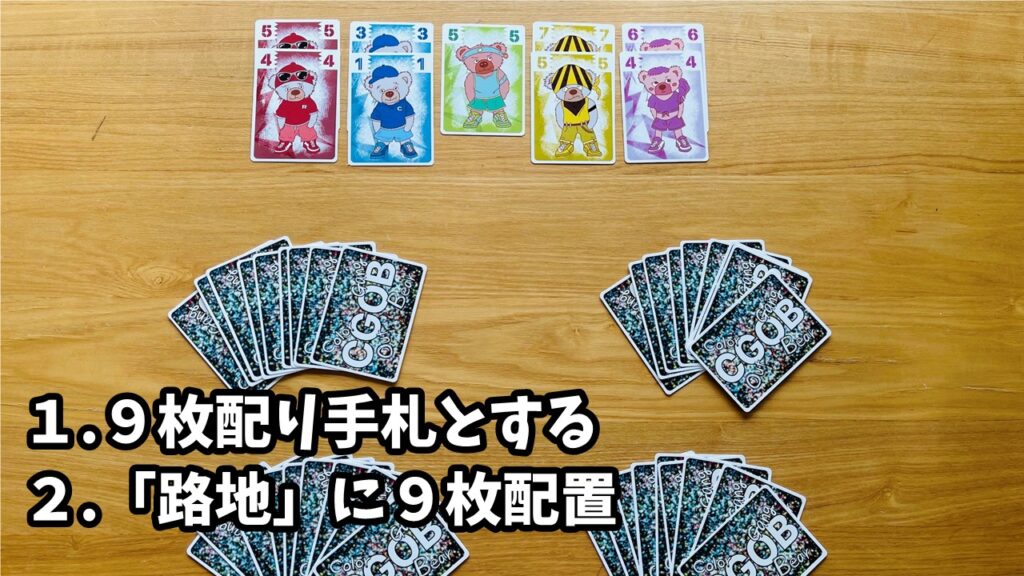 1.全てのカードを裏向きでよく混ぜ、各プレイヤーにカードを9枚ずつ配り手札とします。