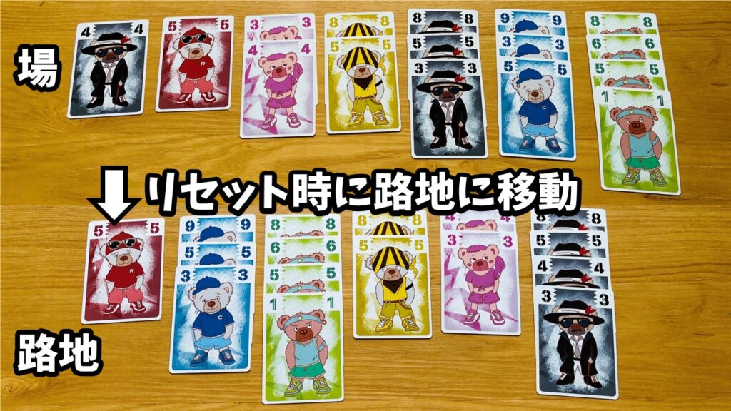 自分がカードをプレイした後に、他のプレイヤー全員が手番で場にプレイせず、再度自分の手番が回ってきた場合、場札と路地のリセットを行います。リセット方法は「路地のルール」を参照