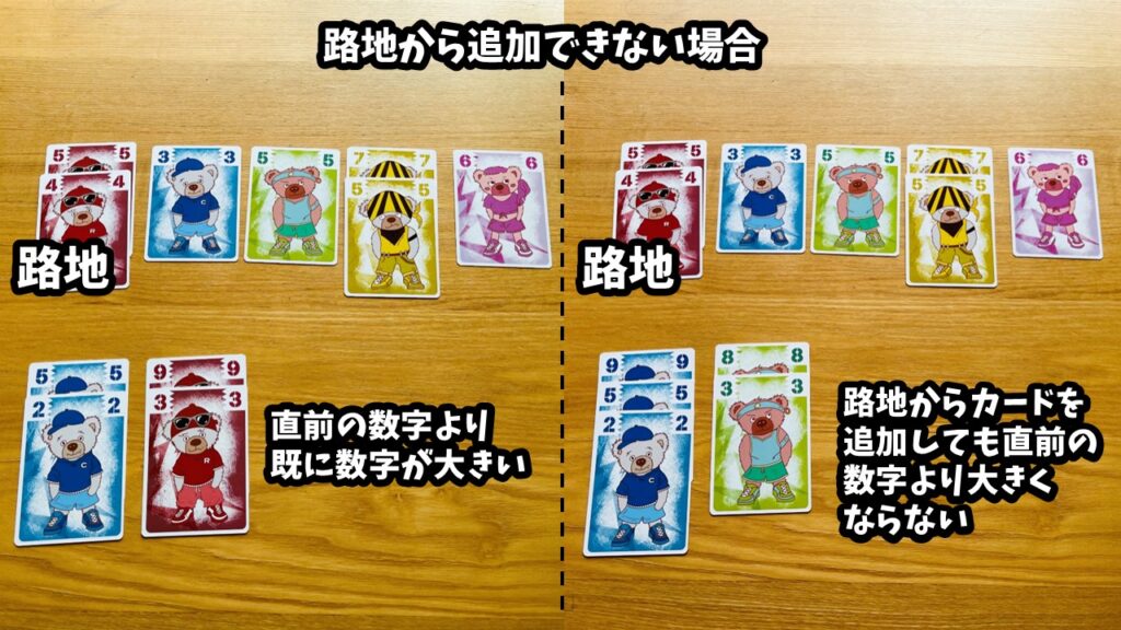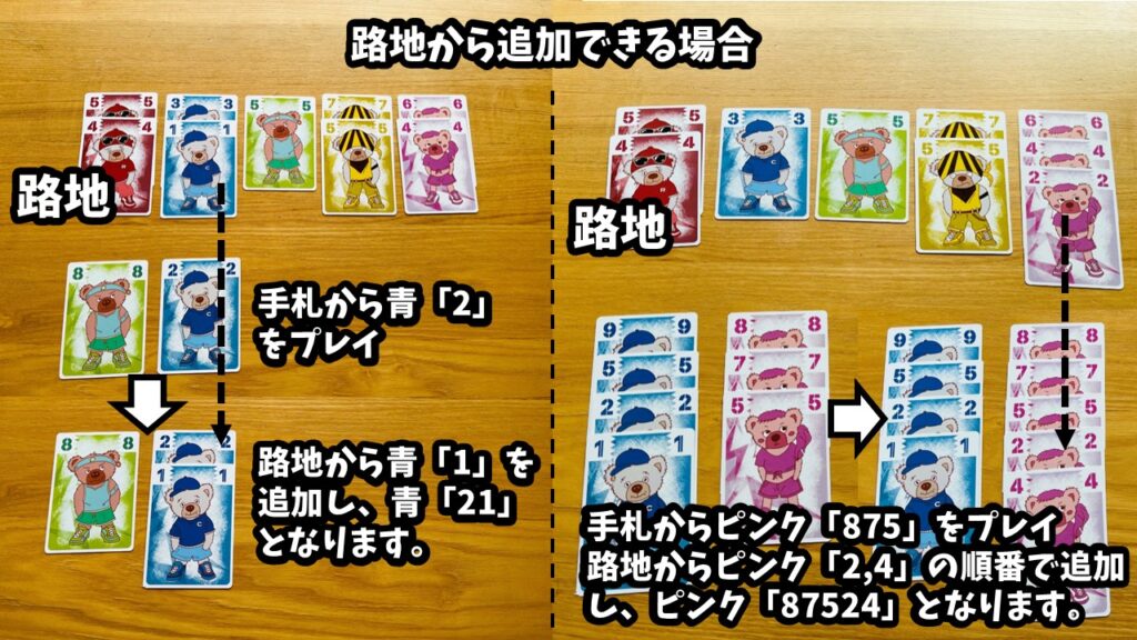 路地からカードを追加する際は低い数字から1枚ずつ追加し、追加するたびに1桁目になります。路地からカードを追加しても直前の数字より大きくならない場合、「A」を行えません。