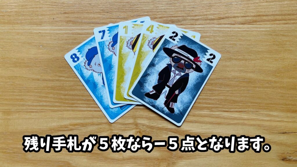いずれかのプレイヤーが手札を出し切った時点で直ちにラウンド終了となり、得点計算に入ります。各プレイヤーは手札の枚数を確認し、手札の枚数分失点となります。失点はメモ等に残し、全プレイヤーが把握できるようにするとよいでしょう。