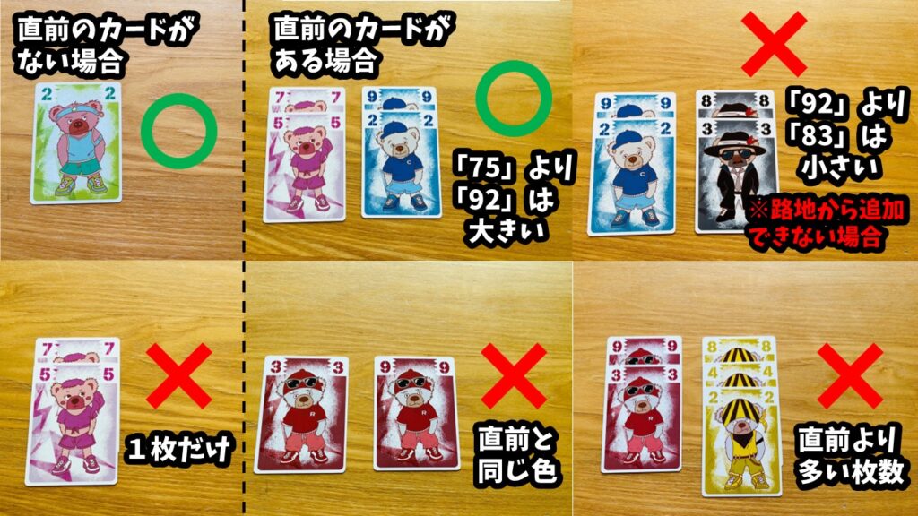 場にカードがある場合、直前でプレイされたカードと同じ枚数以下であればプレイすることができます。また、直前で場にプレイされたカードと同じ色のカードはプレイすることができません。